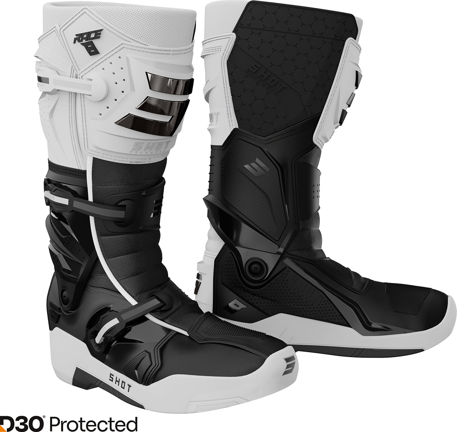 Botas RACE 8 Brancas / Pretas / Cromadas